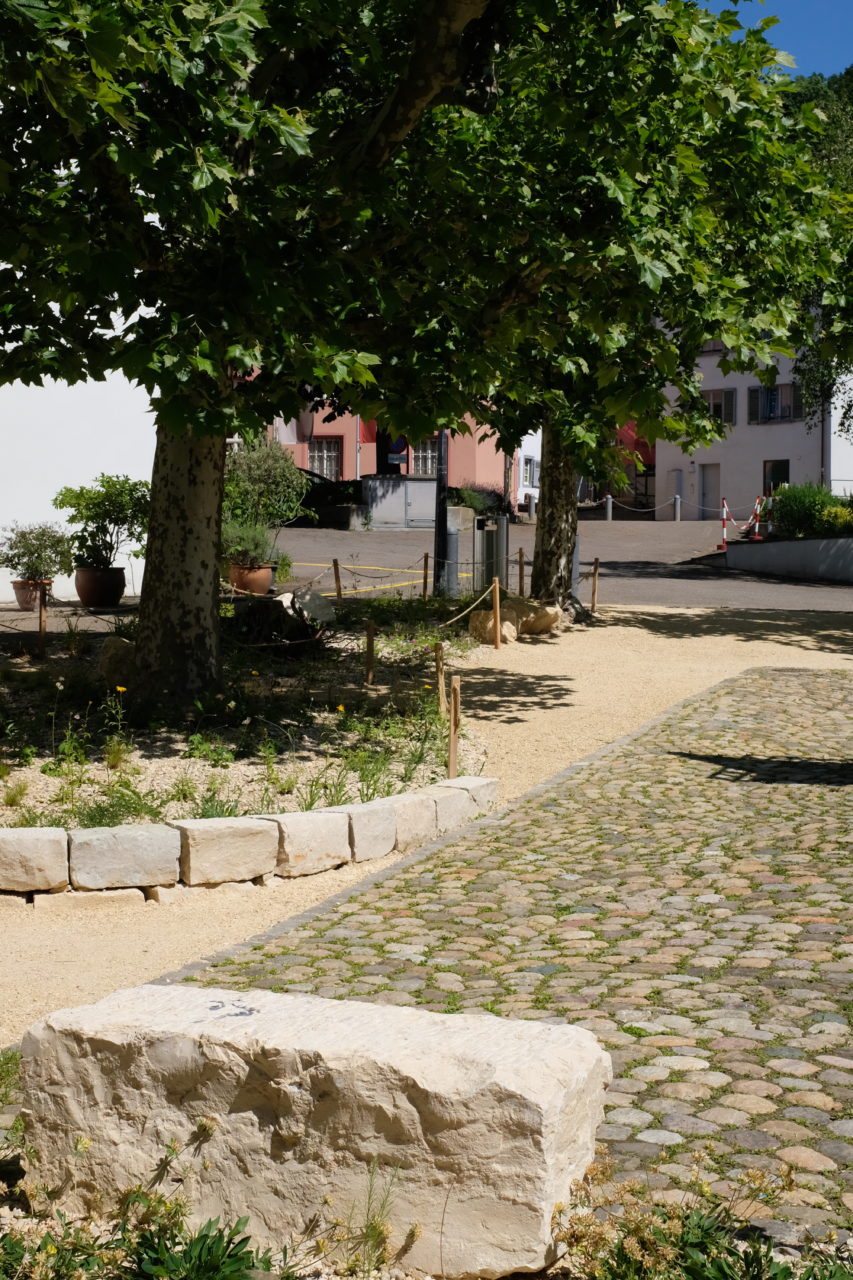 Die Umgestaltung orientiert sich am Schwammstadt-Prinzip: Wasserdurchlässige Beläge, kleine Kalksteinmauern und eine vielfältige Bepflanzung mit einheimischen Wildstauden ermöglichen es, Regenwasser besser im Boden zu speichern. Gleichzeitig wird der Platz ökologisch deutlich aufgewertet – ein Beitrag zur Biodiversität und zum Stadtklima.